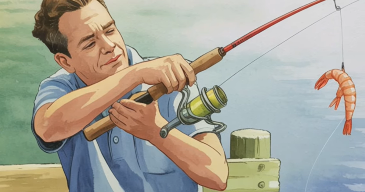That hook snagged him right in the nose, and there he stood — with that piece of shrimp attached to the hook, embedded in his left nostril.